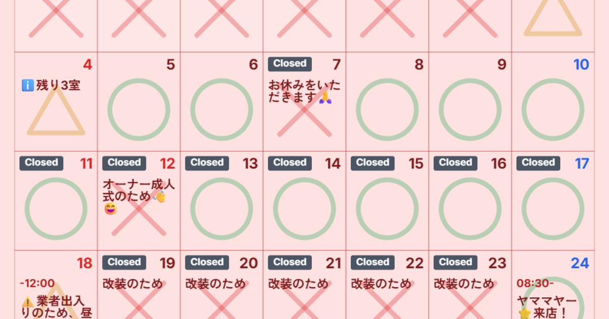 日付をタップすると○△✕が切り替わります。「休」「満」スタンプもあります。面倒な作業はありません。